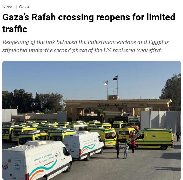 Gaza’s key Rafah border crossing has reopened for limited traffic after almost two years of closure, officials have said. Al Jazeera reports that the crossing – linking the Palestinian enclave with Egypt, Gaza’s only border passage that does not lead to Israel – reopened on Monday. A vital entry point for humanitarian supplies and passage for people awaiting medical evacuation, the crossing’s reopening is stipulated under the United States-brokered “ceasefire” that halted the war between Israel and Hamas in October. Read the full report here.