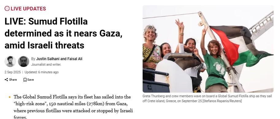 Al Jazeera reports that the Global Sumud Flotilla said its fleet has sailed into the “high-risk zone”, 150 nautical miles (278km) from Gaza, where previous flotillas were attacked or stopped by Israeli forces. UN Special Rapporteur Francesca Albanese and Colombian President Gustavo Petro have demanded that the Flotilla be left to proceed unharmed. The report adds that ships from Spain and Italy have been sailing with the flotilla to ensure its safe passage through international waters, while drones from Turkiye have been circling overhead, in an apparent attempt to monitor any potential attack. As the boats near Gaza, the Sumud Flotilla has made live video available for the safety of those on board. Israel has sworn to stop the Gaza-bound flotilla, the report adds. Read the full report here.