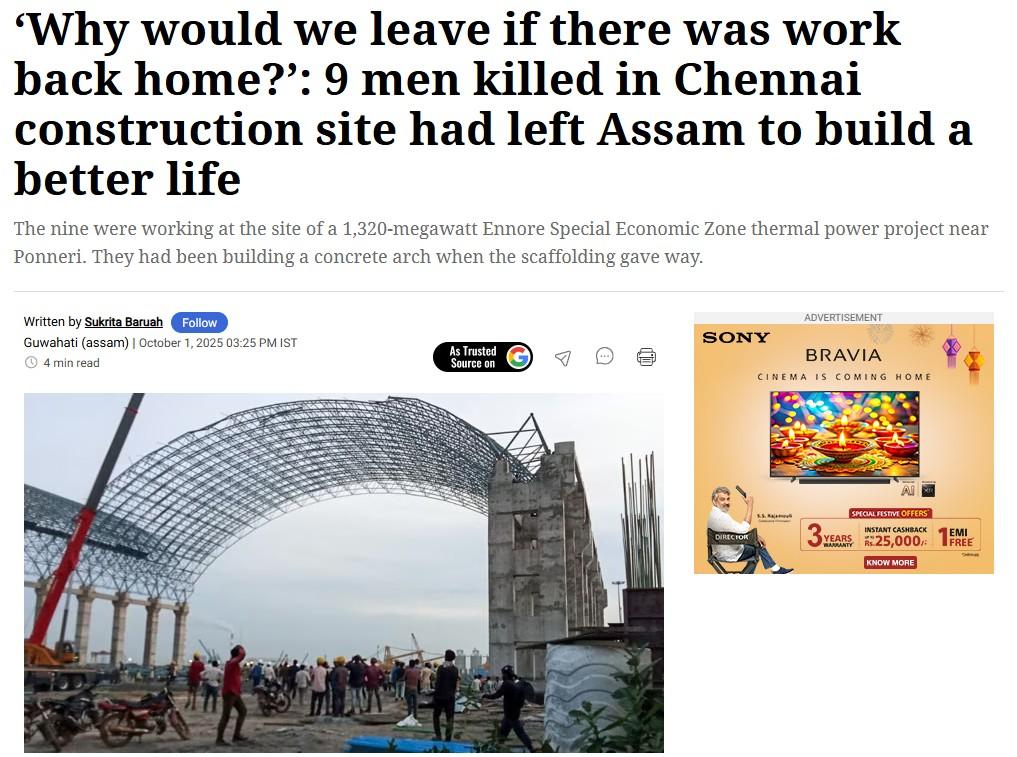 The nine workers who died in an accident at a construction site in north Chennai on Tuesday night were all young men from the Dimasa tribe, Indian Express reports, hailing from a cluster of villages in Assam and living and working together in Tamil Nadu. The report says that the nine were working at the site of a 1,320-megawatt Ennore Special Economic Zone thermal power project near Ponneri. They had been building a concrete arch over 20 feet above the ground when the metal scaffolding gave way, sending them crashing down nearly 30 feet. Read the full report here.
