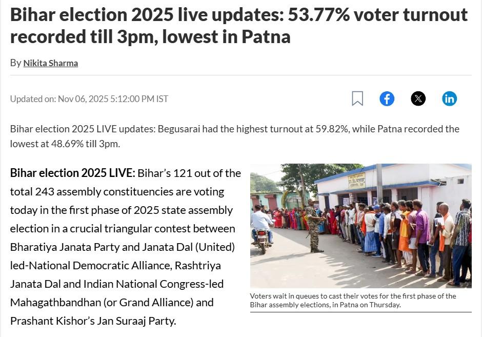 Bihar’s 121 out of the total 243 assembly constituencies are voting today in the first phase of 2025 state assembly election, Hindustan Times reports. The report calls it a crucial triangular contest between Bharatiya Janata Party and Janata Dal (United) led-National Democratic Alliance, Rashtriya Janata Dal and Indian National Congress-led Mahagathbandhan (or Grand Alliance) and Prashant Kishor’s Jan Suraaj Party. Polling started at 7 am and will conclude at 6 pm, and in some places, at 5 pm. Bihar has recorded a voter turnout of 53.77 per cent as of 3pm in the first phase of assembly elections, the report adds. Read the full report here.
