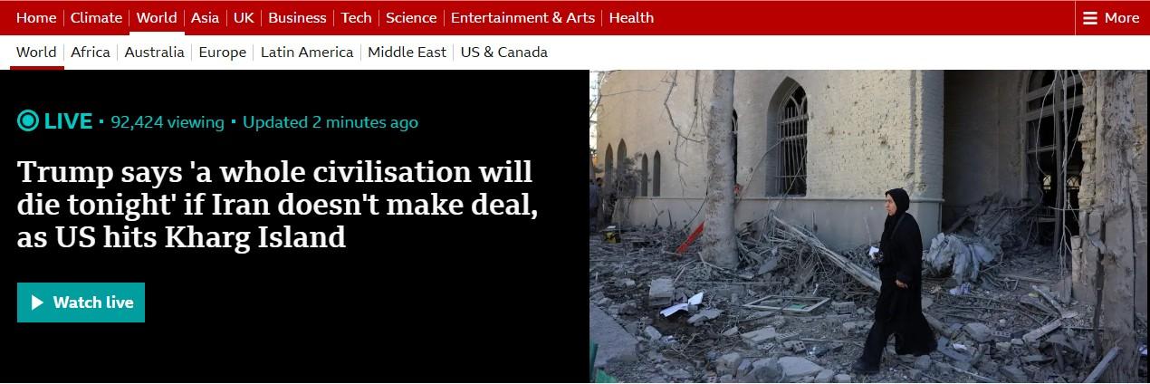 US President Donald Trump warned "a whole civilisation will die tonight" unless Iran reaches a deal on reopening the Strait of Hormuz, BBC reports. But he added that "something revolutionarily wonderful can happen" before his deadline on Tuesday for Iran to reopen the key shipping channel. The US has carried out new strikes on military targets on Kharg Island, Iran's key oil export terminal, the BBC's US partner CBS reports. Read the full report here.