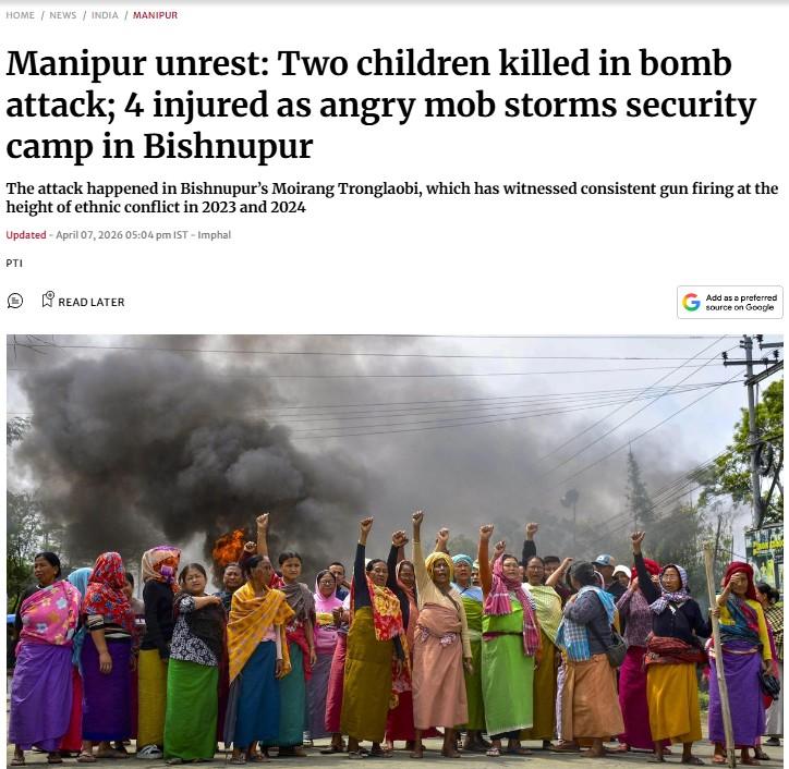The Hindu reports that two children were killed and their mother was injured in a bomb attack in Manipur’s Bishnupur district on Tuesday, triggering protests by locals. The incident occurred at around 1 a.m. when a bomb was hurled by suspected militants at a house in Moirang Tronglaobi area, killing a 5-year-old boy and a six-month-old girl, a senior officer said. In the wake of the killing of two children, a mob stormed a security forces camp in the Bishnupur district, injuring at least four people in the ensuing gunfire. The report says that the shooting occurred after the protesters attacked the central force camp, located about 200 metres from Tronglaobi, and vandalised it. Chief Minister Y. Khemchand Singh described the attack as a “barbaric act” and assured the people that those responsible for the crime would be identified and dealt with firmly under the law. Read the full report here.