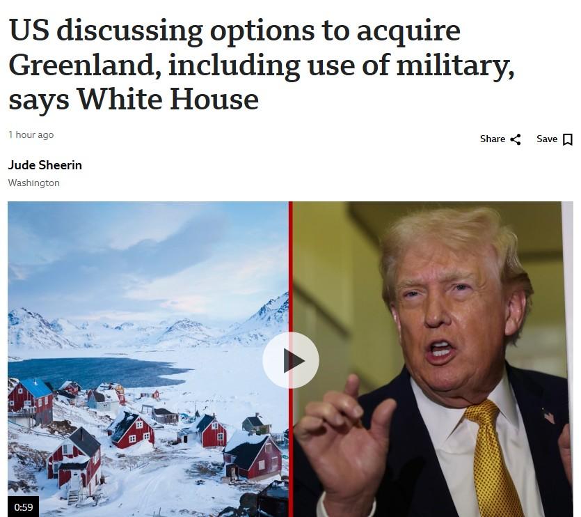 US President Donald Trump has been discussing "a range of options" to acquire Greenland, including use of the military, BBC reports as per the White House. The White House told the BBC that acquiring Greenland - a semi-autonomous region of fellow Nato member Denmark – was a "national security priority". The statement came hours after European leaders issued a joint statement rallying behind Denmark, which has been pushing back against Trump's ambitions for the Arctic island. Trump repeated over the weekend that the US "needed" Greenland for security reasons, the report adds, prompting Danish Prime Minister Mette Frederiksen to warn that any attack by the US would spell the end of Nato. Read the full report here.