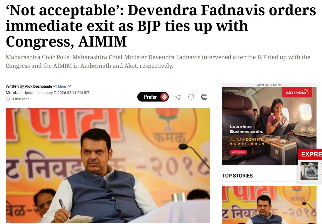 Maharashtra Chief Minister Devendra Fadnavis on Wednesday directed the BJP to break its alliances with the Congress and the All India Majlis-e-Ittehadul Muslimeen (AIMIM) in two municipal councils, saying the tie-ups were “not acceptable”. Indian Express reports that in Ambernath, in a bid to keep the Eknath Shinde-led Shiv Sena out of power, the BJP formed an Ambernath Vikas Aghadi. The alliance comprises 14 BJP members, 12 from the Congress, four from the Ajit Pawar-led Nationalist Congress Party (NCP) and one Independent. The report also adds that in the Akot municipal council in Vidarbha’s Akola district, the BJP has established an ‘Akot Vikas Manch’ (Akot Development Forum), where it has allied with the AIMIM, which won five seats. Read the full report here.