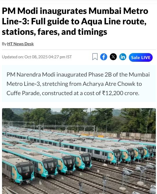 Prime Minister Narendra Modi inaugurated the final phase of Mumbai Metro Line-3, also called Acqua Line, Hindustan Times reports, during his two-day Maharashtra visit that began on Wednesday. Mumbai’s first fully underground Metro corridor will become fully operational after Prime Minister Narendra Modi inaugurated the 10.99-km final stretch between Acharya Atre Chowk and Cuffe Parade stations, the report says. After reaching Navi Mumbai on Wednesday, Modi undertook a walkthrough of the newly built Navi Mumbai International Airport. He inaugurated the airport and will also launch and dedicate various projects in Mumbai. Read the full report here.