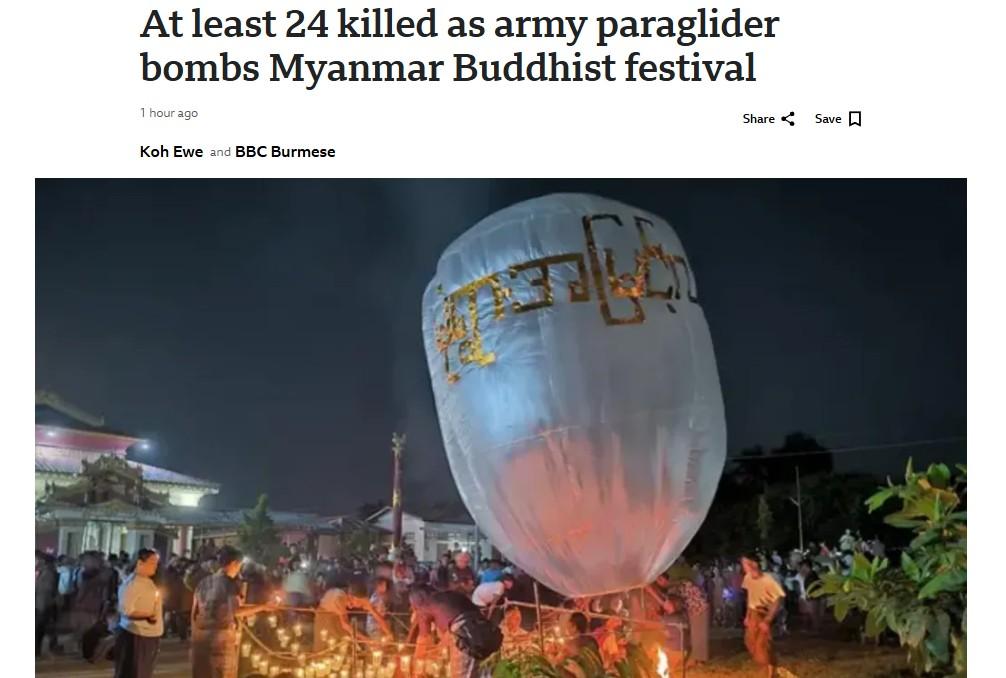 At least 24 killed as army paraglider bombs Myanmar Buddhist festival, BBC reports