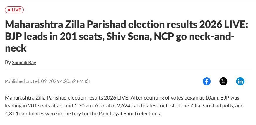 Vote counting for 12 Zilla Parishads and 125 Panchayat Samitis began in Maharashtra today and trends in 129 of the 731 seats have emerged. Hindustan Times reports that, Bharatiya Janata Party was leading in 48 of the 731 seats across 12 councils, Shiv Sena was ahead in 29 seats, followed by the Nationalist Congress Party (NCP) with 24 at around 10.40 am. The opposition Congress was leading in 12 seats, while the Sena (UBT) was ahead in 10, the report says. The polls were held on Saturday in 12 Zilla Parishads - Raigad, Ratnagiri, Sindhudurg, Pune, Satara, Sangli, Solapur, Kolhapur, Chhatrapati Sambhajinagar, Parbhani, Dharashiv and Latur. Read the full report here.
