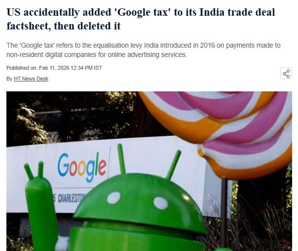 India had already abolished its 6 percent equalisation levy on digital advertising, popularly known as the “Google tax”, well before the India–US trade framework was announced, Hindustan Times reports, even as an earlier White House fact sheet suggested the move was part of the bilateral deal. The levy on digital advertising services provided by foreign technology firms was removed through amendments in the Finance Bill 2025, with effect from April 1, 2025. The report says that the rollback came nearly 10 months before the trade framework between New Delhi and Washington was unveiled. Read the full report here.