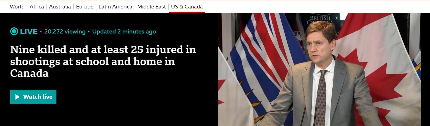 Nine killed and at least 25 injured in shootings at school and home in Canada, BBC reports