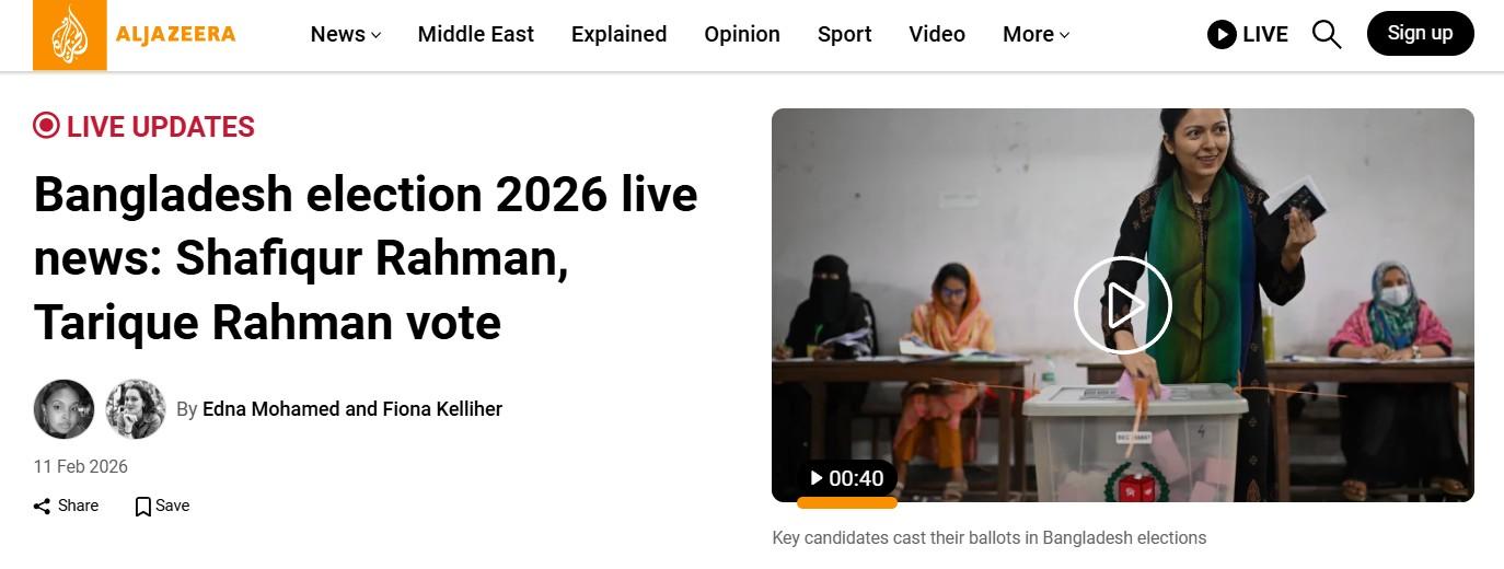 Voting is under way in Bangladesh in a crucial election seen as a key test of the country’s return to democracy after a student-led uprising toppled longtime leader Sheikh Hasina in August 2024, Al Jazeera reports. The vote is a direct contest between the Bangladesh Nationalist Party (BNP) and a Jamaat-e-Islami-led coalition of 11 parties, including the National Citizens Party (NCP), formed by youth activists instrumental in ousting Hasina. Besides the parliamentary election, the report says that the country is holding a referendum on the National Charter 2025 – a document drafted by the interim government led by Muhammad Yunus, setting the foundation for future governance. Read the full report here.