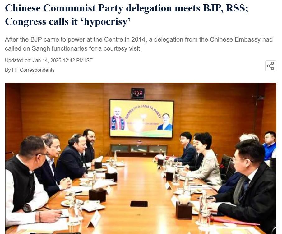 A delegation of the Communist Party of China (CPC) met senior functionaries of the Rashtriya Swayamsevak Sangh (RSS) in New Delhi on Tuesday, Hindustan Times reports, a day after holding discussions with senior leaders of the Bharatiya Janata Party (BJP) at the party headquarters. While BJP leaders maintained that the two sides discussed ways to enhance dialogue, the Congress party questioned the timing and intent of the meeting, alleging that China laid claim to the Shaksgam Valley in Jammu and Kashmir within hours of the closed-door interaction at the BJP headquarters. This was not the first such visit by a Chinese delegation, the report adds. Read the full report here.