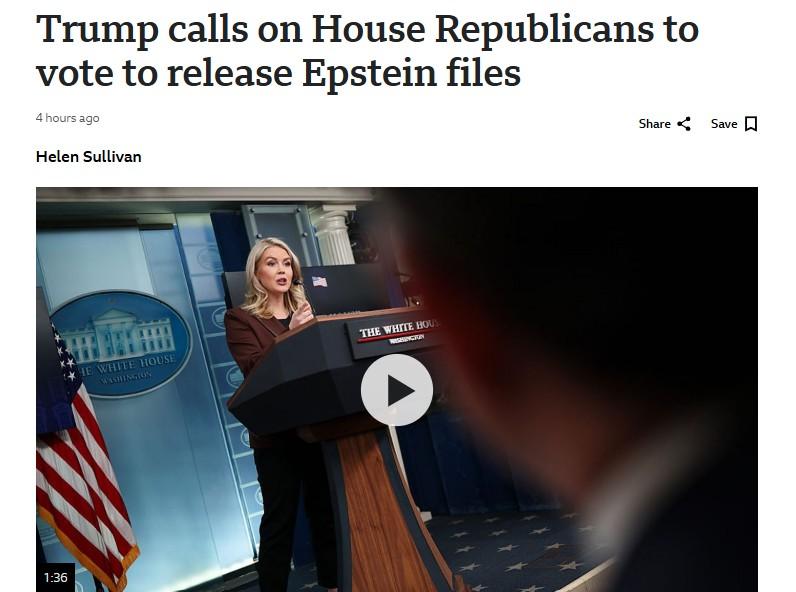 US President Donald Trump has urged lawmakers in his own party to vote to release files relating to the late convicted sex offender Jeffrey Epstein, BBC reports. Trump wrote on Sunday night that Republicans in the House of Representatives should do so "because we have nothing to hide". The report says that the reversal of his recent position follows a slow drip feed of documents concerning the disgraced financier by House Democrats, some of which reference Trump, who has always denied any link to Epstein's sex abuse and trafficking. Read the full report here.