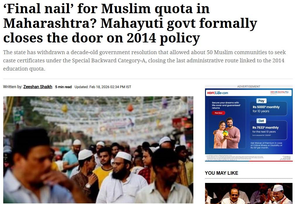 The Maharashtra government on Tuesday formally withdrew a decade old Government Resolution that had enabled members of around 50 identified Muslim communities to obtain caste and caste validity certificates under the Special Backward Category A SBC A framework. Indian Express reports that this effectively shuts the last administrative route that could have supported reservation claims in education. With the latest order, the state has terminated all previous resolutions issued on the subject, including those related to granting caste certificates to Muslims seeking benefits under SBC A. The move brings formal closure to a policy first introduced in 2014 but never fully implemented, the report says. Read the full report here.