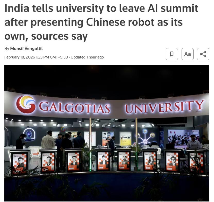 An Indian university has been asked to vacate its stall at the country's flagship AI summit after a staff member was caught presenting a commercially available robotic dog made in China as its own creation, Reuters reports as per its government sources. "You need to meet Orion. This has been developed by the Centre of Excellence at Galgotias University," Neha Singh, a professor of communications, told state-run broadcaster DD News this week in remarks that have since gone viral. But the report says that social media users quickly identified the robot as the Unitree Go2, sold by China's Unitree Robotics for about $2,800 and widely used in research and education globally. The report says that the episode has drawn sharp criticism and has cast an uncomfortable spotlight on India's artificial intelligence ambitions. Read the full report here.