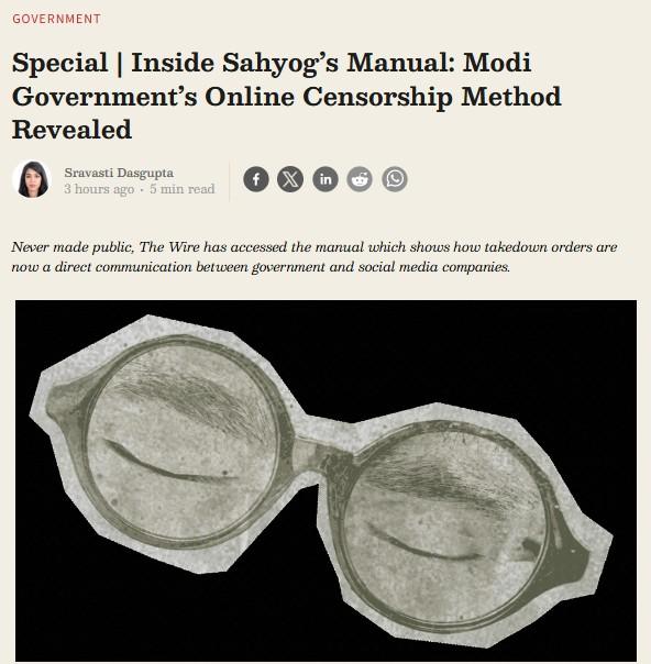 The Wire has accessed the User Manual for Sahyog Portal (IT intermediaries) that lays down the union government’s takedown mechanism for content online. The report says that the never-made-public manual makes it clear that orders are unilateral, and a direct correspondence between government agencies and intermediaries like social media platforms and telecom providers. The manual excludes journalists or content creators from its definition of “stakeholders”. It does not detail any independent review process before an item is ordered to be taken down, the report says. Read the full report here.