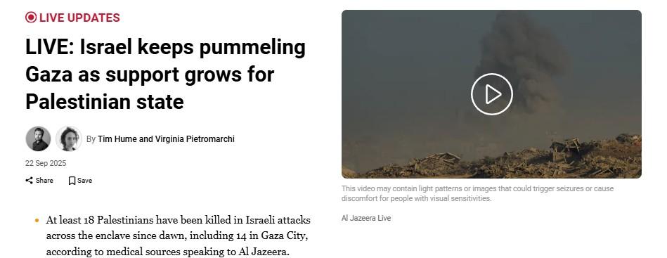 At least 18 Palestinians have been killed in Israeli attacks across the enclave since dawn, including 14 in Gaza City, according to medical sources speaking to Al Jazeera. France and Saudi Arabia are due to convene dozens of world leaders to rally support for a two-state solution, with several of them expected to formally recognise a Palestinian state – a move that could draw harsh Israeli and US responses. The report says that the development comes a day after Canada, Australia, and Portugal joined the United Kingdom in formally recognising Palestinian statehood. Read the full report here.