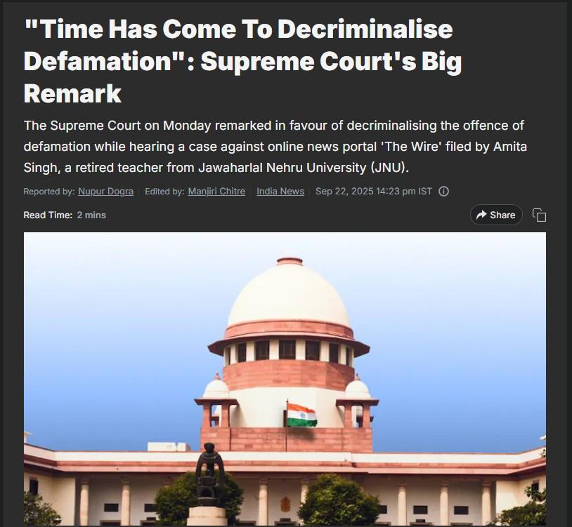 NDTV on Supreme Court's big remark: "Time has come to decriminalise defamation"