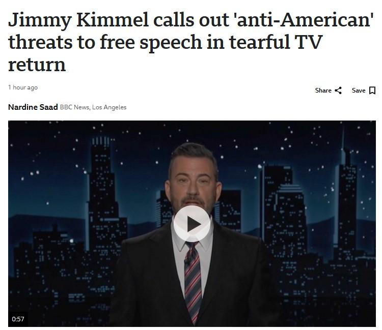 Jimmy Kimmel calls out 'anti-American' threats to free speech in tearful TV return, BBC reports
