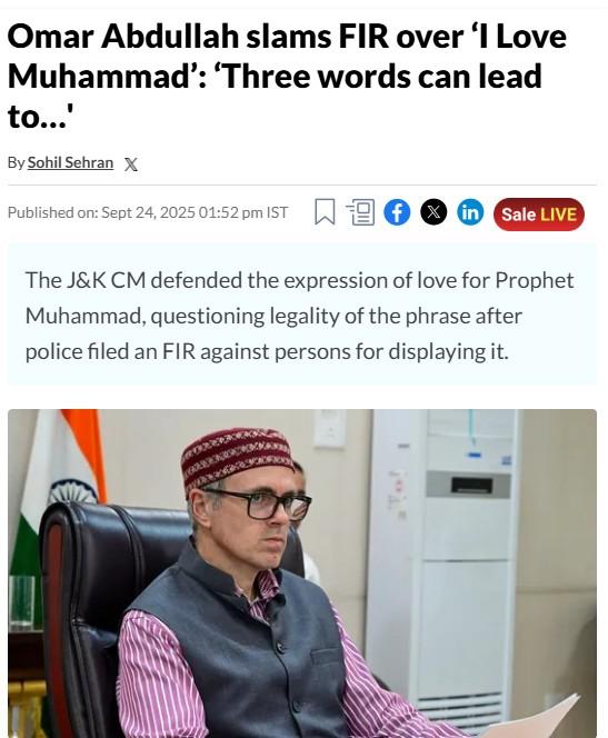 Jammu and Kashmir chief minister Omar Abdullah on Wednesday fiercely defended the right to express love for the Prophet Muhammad, questioning how three simple words — “I Love Muhammad” — could be deemed unlawful and urging the courts to act swiftly. Hindustan Times reports that The controversy began on September 9, when Kanpur police registered an FIR against nine named and 15 unidentified persons for allegedly putting up boards reading “I Love Mohammad” on a public road during a Barawafat (Eid Milad-un-Nabi) procession on September 4. Hindu organisations objected, calling it a “new trend” and claiming it was a deliberate provocation. Read the full report here.