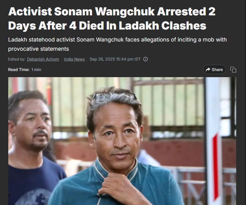 Activist Sonam Wangchuk arrested 2 days after 4 died in Ladakh clashes, NDTV reports