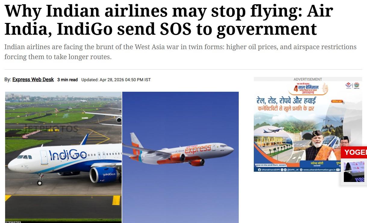 Air India, IndiGo and SpiceJet have said they are on the verge of “stopping operations” and have sought the government’s “urgent intervention” amid high jet fuel prices, Indian Express reports. The country’s top airlines are facing the double whammy of higher aviation turbine fuel (ATF) prices and longer routes due to war-related airspace restrictions. The report mentions that airlines incur nearly 40 percent of their operational expenses on procuring jet fuel. The West Asia turmoil has pushed up oil prices, and airspace restrictions have increased airlines’ operating costs, especially on long-haul routes. Read the full report here.
