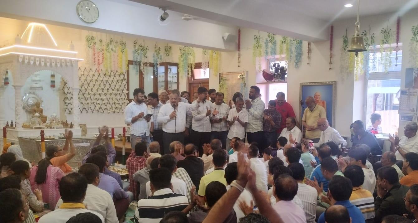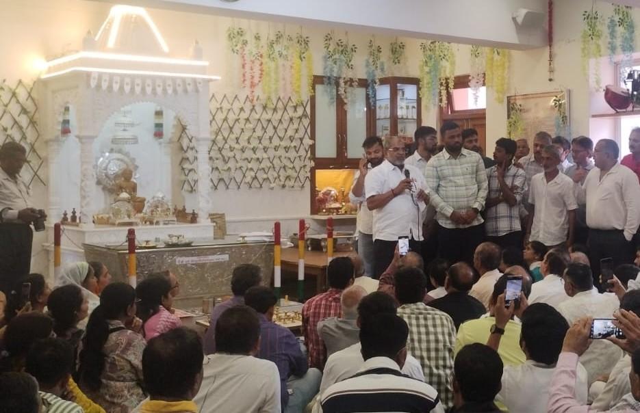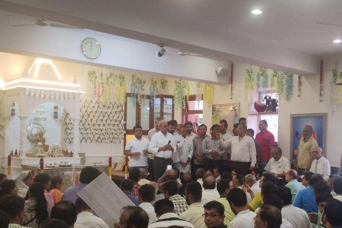 जमलेल्या जैन समूहातील नागरिकांना संबोधित करताना विश्वस्त चकोर गांधी.