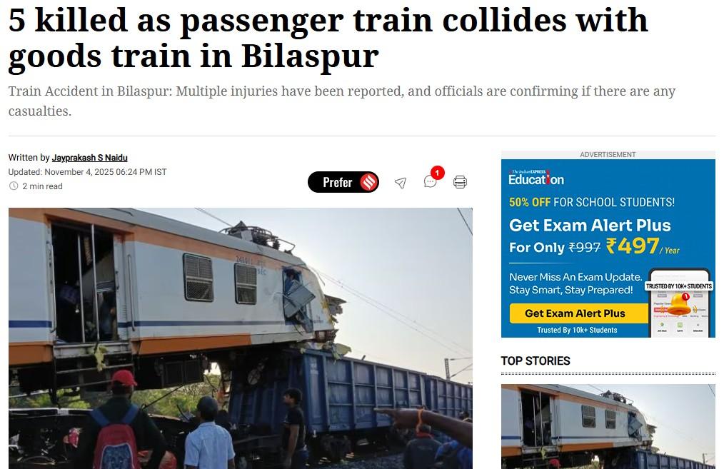 5 killed as passenger train collides with goods train in Bilaspur: Indian Express