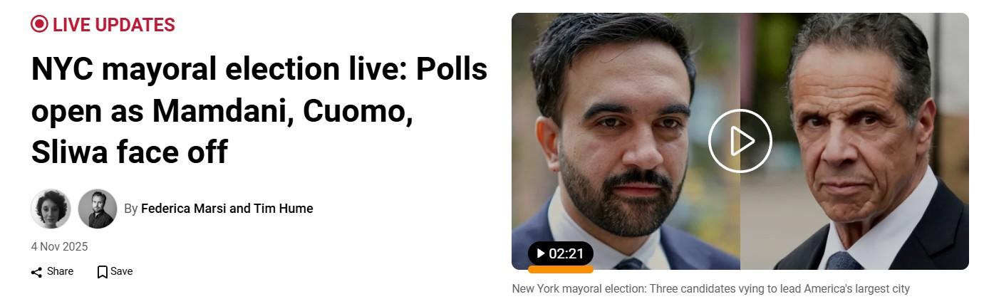 Voters in New York City are taking to the polls to pick their new mayor in a race standing out for its three-way dynamic with progressive, establishment and conservative candidates vying for control of the largest city in the United States, Al Jazeera reports. Opinion polls showed Democrat Zohran Mamdani holding a clear lead over independent Andrew Cuomo and Republican Curtis Sliwa. The report adds that Mamdani, who calls himself a democratic socialist, has drawn liberal voters with plans for free childcare, free bus transport and a rent freeze affecting roughly one million rent-regulated New Yorkers. If elected, he will be the city’s first Muslim mayor. Read the full report here.