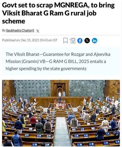 The Prime Minister Narendra Modi-led government will replace the country’s flagship job scheme, the Mahatma Gandhi National Rural Employment Guarantee Act 2005 (MGNREGA) with Viksit Bharat—Guarantee for Rozgar and Ajeevika Mission (Gramin) VB—G RAM G BILL, 2025. Hindustan Times reports that the legislation will establish a “rural development framework aligned with the national vision of Viksit Bharat @2047. It will be done by providing a statutory guarantee of one hundred and twenty-five days of wage employment in every financial year to every rural household whose adult members volunteer to undertake unskilled manual work; to promote empowerment, growth, convergence and saturation for a prosperous and resilient rural Bharat. Read the full report here.