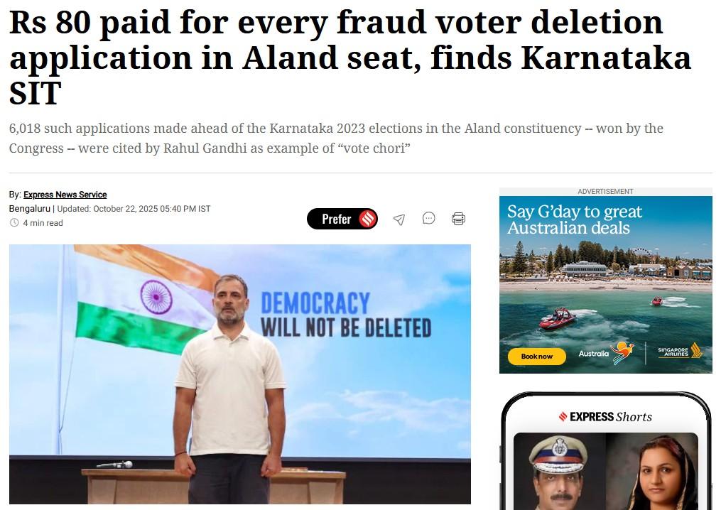 Indian Express: Karnataka SIT finds, Rs 80 paid for every fraud voter deletion application in Aland seat