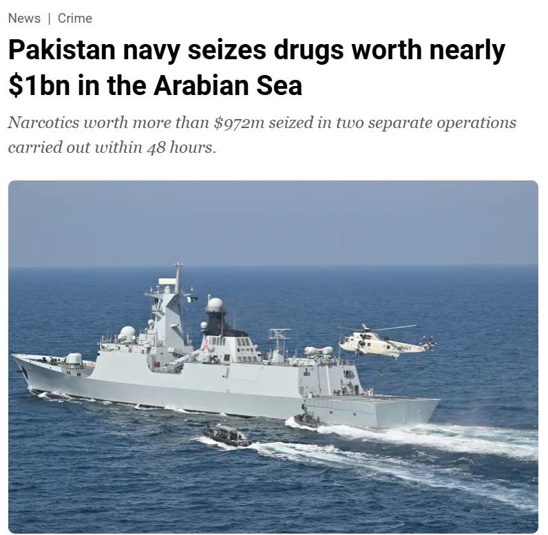 The Pakistani navy, operating as part of the Saudi-led Combined Maritime Forces (CMF), has seized nearly $1bn worth of narcotics from two vessels sailing through the Arabian Sea, Al Jazeera reports. The CMF, the naval network overseeing the operation, said in a statement on Wednesday that last week, the Pakistani navy intercepted the dhows in two separate operations over 48 hours and seized narcotics worth more than $972m, the report says. The crew boarded the first dhow and seized more than 2 tonnes of “crystal methamphetamine (ICE) with an estimated street value of $822,400,000” on October 18, the CMF said in a statement. Read the full report here.