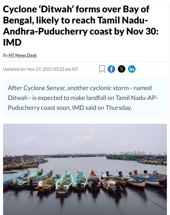 While the weather system in Strait of Malacca which intensified and became Cyclone ‘Senyar’ moved away from the Indian coast, Hindustan Times reports that another low-pressure area over southwest Bay of Bengal has turned into a cyclonic storm, with landfall expected on Tamil Nadu, Puducherry and adjoining south Andhra Pradesh coast by November 30. The India Meteorological Department (IMD) said in the early hours o Thursday Cyclone Senyar lay 850 km southeast of Car Nicobar - northernmost island of the Nicobar Islands - and was expected to weaken into a depression by evening. Another weather system, however, parallelly brewed over southwest Bay of Bengal and adjoining areas of southeast Sri Lanka and Equatorial Indian Ocean, the report says. Read the full report here.
