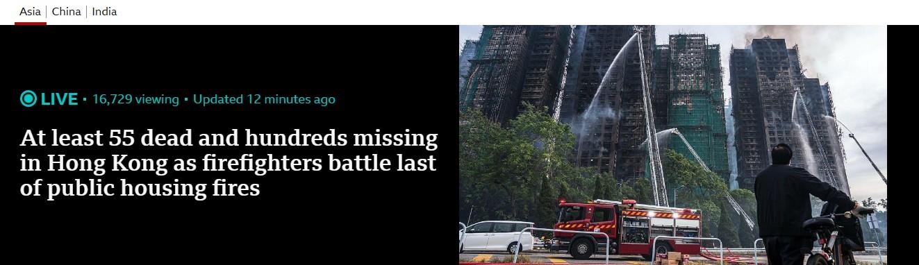 At least 55 people have been killed in a huge fire engulfing a high-rise public housing complex in Hong Kong - hundreds are still unaccounted for, BBC reports. The blaze tore through seven of eight tower blocks in Tai Po district. Fires are under control in four, and officials hope to quell those remaining by evening. Wang Fuk Court is home to some 4,600 residents, according to the latest figures. The report says it's unclear how many were inside when the fire broke out. Read the full report here.