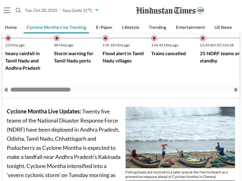 India Meteorological Department has predicted that Cyclone 'Montha' is likely to hit the coastal shores of Andhra Pradesh by tonight. Hindustan Times reports that heavy rainfall has lashed parts of Andhra Pradesh, Tamil Nadu, Odisha disrupting air and rail traffic. Twenty five teams of the National Disaster Response Force (NDRF) have been deployed in Andhra Pradesh, Odisha, Tamil Nadu, Chhattisgarh and Puducherry. Cyclone Montha intensified into a ‘severe cyclonic storm’ on Tuesday morning, the report adds. Read the full report here.
