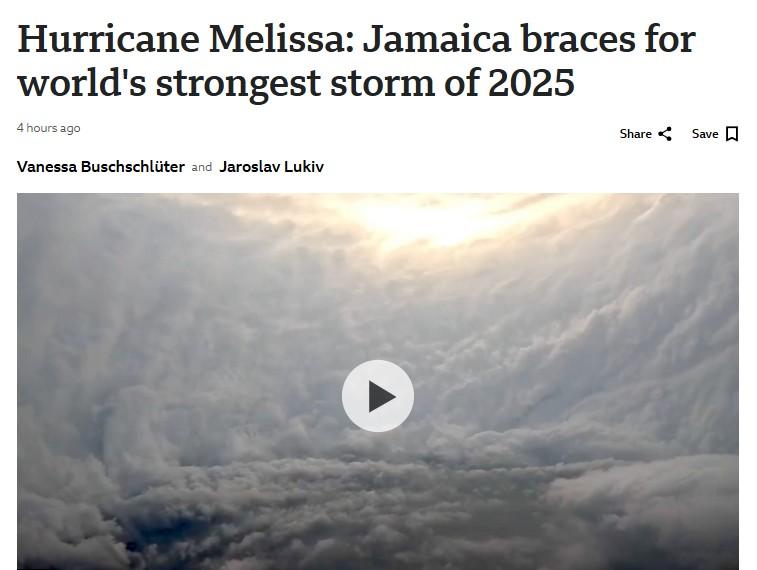 Three people have already died in Jamaica as it braces for the world's strongest storm this year - and possibly the strongest on record for the island, BBC reports. The US meteorologists have warned of "catastrophic and life-threatening" conditions. With wind speeds of up to 282km/h, Hurricane Melissa is a category five storm - the maximum strength. It is intensifying and expected to make landfall on the Caribbean island early on Tuesday. The report adds that it has been blamed for four deaths in Haiti and the Dominican Republic, in addition to the lives lost in Jamaica. Read the full report here.