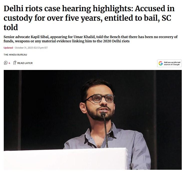 The Supreme Court on Friday was told that the seriousness of the offence cannot be a determining factor when bail is sought on the ground of prolonged incarceration of an undertrial, The Hindu reports. A Bench of Justices Aravind Kumar and N.V. Anjaria was hearing the bail pleas of activists Umar Khalid, Sharjeel Imam, Meeran Haider, Gulfisha Fatima and Shifa-ur-Rehman in the larger conspiracy case linked to the 2020 Delhi riots. The report says that the Bench will continue hearing the matter on Monday and has listed it top of the board. Appearing for the petitioners, senior advocates Kapil Sibal, A.M. Singhvi, and Siddharth Dave argued that the accused have spent over five years in custody while the trial is yet to commence. Read the full report here.