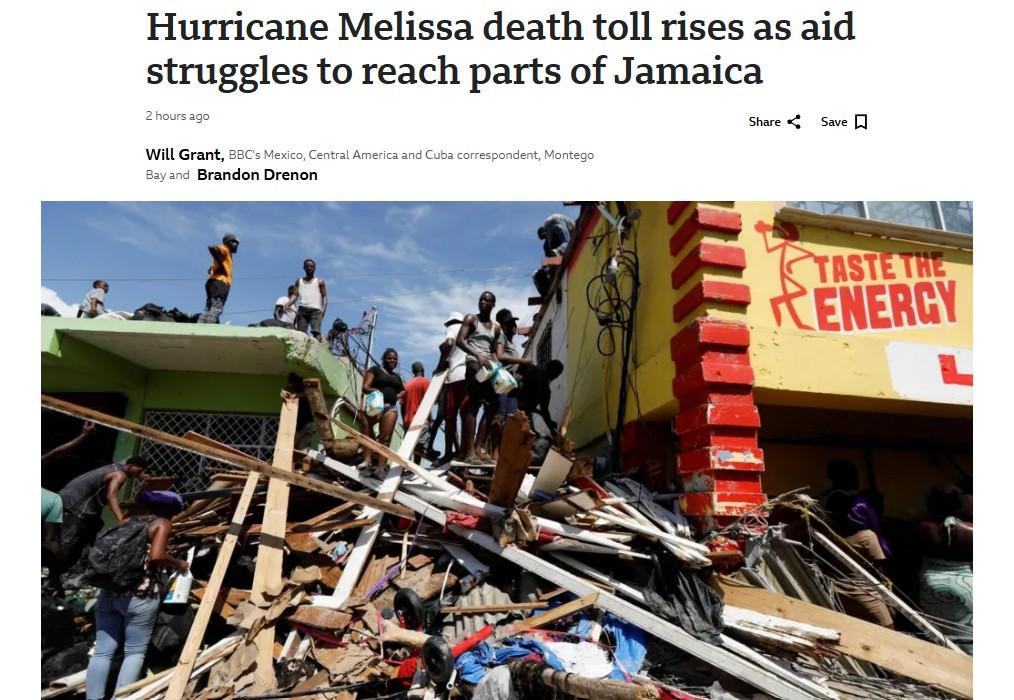 Hurricane Melissa death toll rises as aid struggles to reach parts of Jamaica, BBC reports