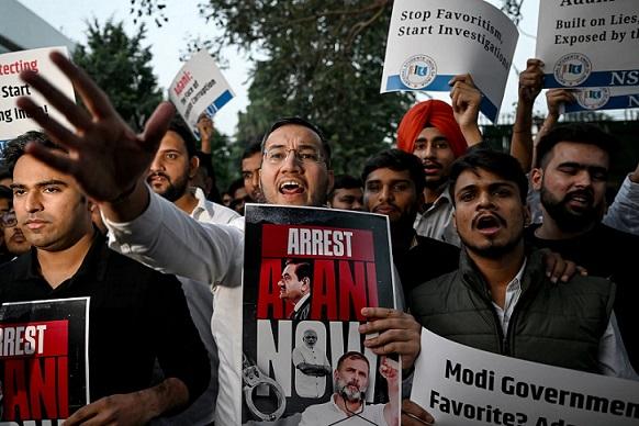 नॅशनल स्टुडंट्स युनियन ऑफ इंडियाचे कार्यकर्ते २१ नोव्हेंबरला नवी दिल्लीत अदानींविरुद्ध निदर्शनं करताना. (अरुण सनकर/AFP/Getty Images)