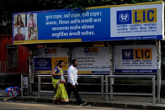 मुंबईतल्या बस स्टॉपवर देशातल्या सर्वात मोठ्या सार्वजनिक विमा कंपनी, लाइफ इन्शुरन्स कॉर्पोरेशन ऑफ इंडियाच्या जाहिराती दिसतात. (सुजित जैस्वाल/AFP/Getty Images)